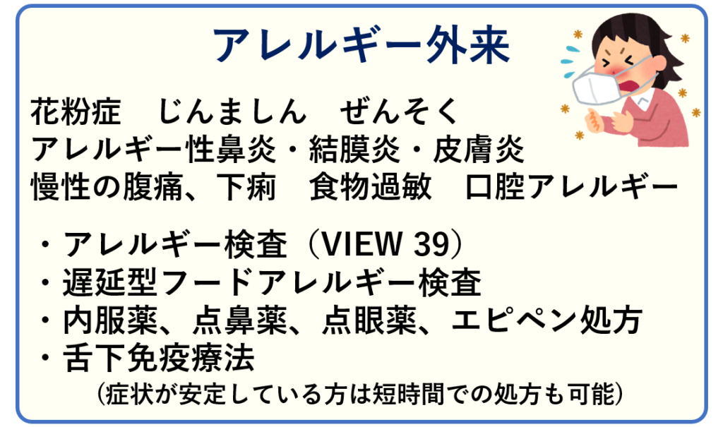 当院は内科を基本としつつ、患者さまのお悩みについて総合的な診療を行っております。